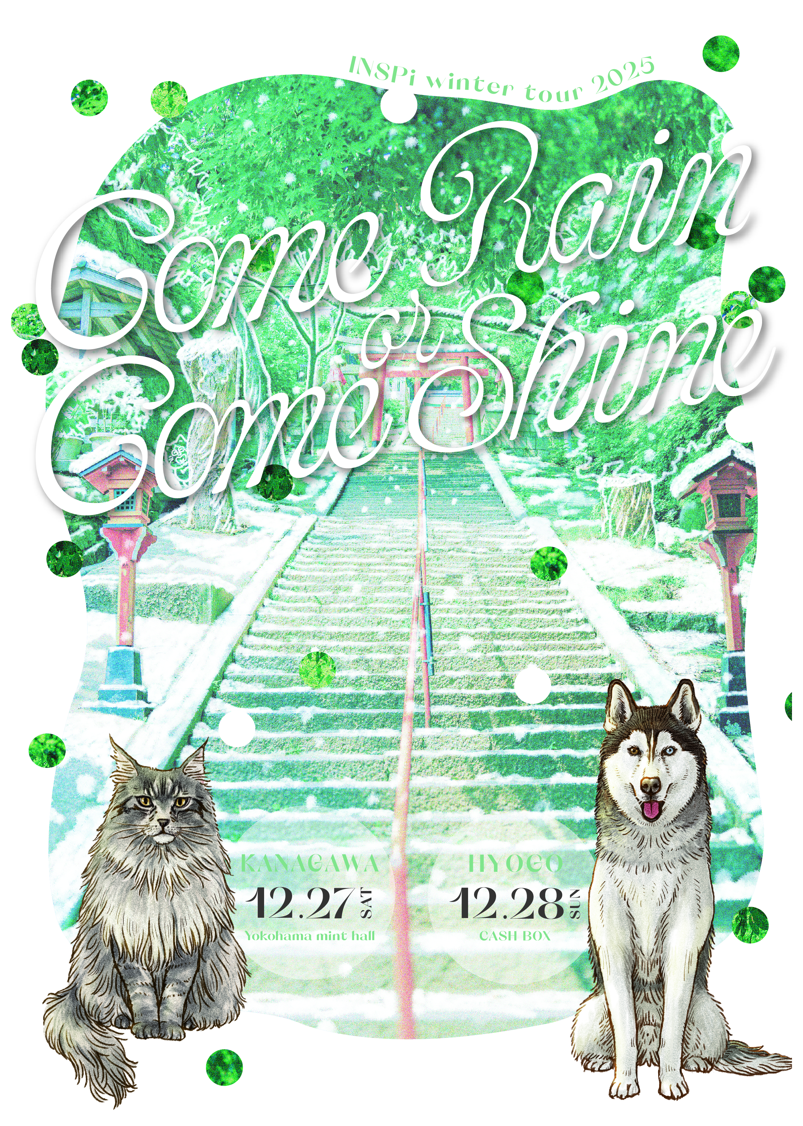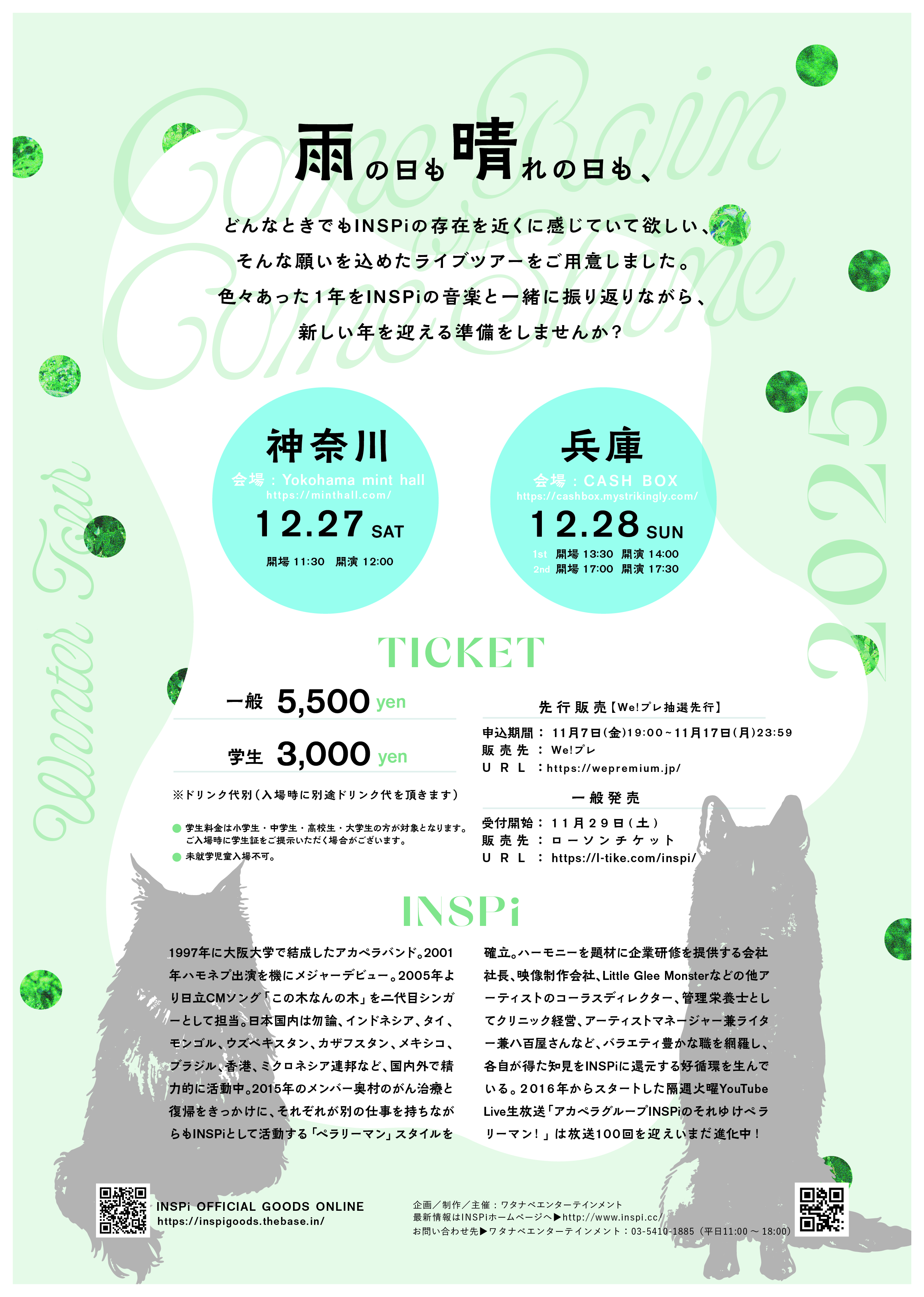 2025/12/27(土)INSPi冬ツアー2025~Come Rain or Come Shine~横浜公演 INSPi Winter Tour 2025~Come Rain or Come Shine~開催決定!雨の日も晴れの日も、どんなときでもINSPiの存在を近くに感じていて欲しい、 そんな願いを込めたライブツアーをご用意しました。 色々あった1年をINSPiの音楽と一緒に振り返りながら、 新しい年を迎える準備をしませんか? <公演概要> 【神奈川】 2025/12/27(土) 横浜ミントホール 開場 11:30 / 開演 12:00 【兵庫】 2025/12/28(日) CASH BOX [1部] 開場 13:30 / 開演 14:00 [2部] 開場 17:00 / 開演 17:30 【チケット料金】 5,500円(税込) ※全自由/整理番号順入場 ※未就学児入場不可 ※ドリンク代別 ※We!プレ先行では学生チケット(3,000円)の取り扱いはございません。 We!プレ抽選先行チケットお申込みはこちら! https://wepremium.jp/t/2272/ 【受付期間】2025/11/7 19:00~2025/11/17 23:59 【抽選結果発表】2025/11/21 19:00~ 【入金・発券期間】2025/11/21 19:00~2025/11/27 23:00 ※クレジットカード・キャリア決済は、公演当日開演前まで発券可 ![]() ![]() INSPi夏ツアー2025~日々是好日~