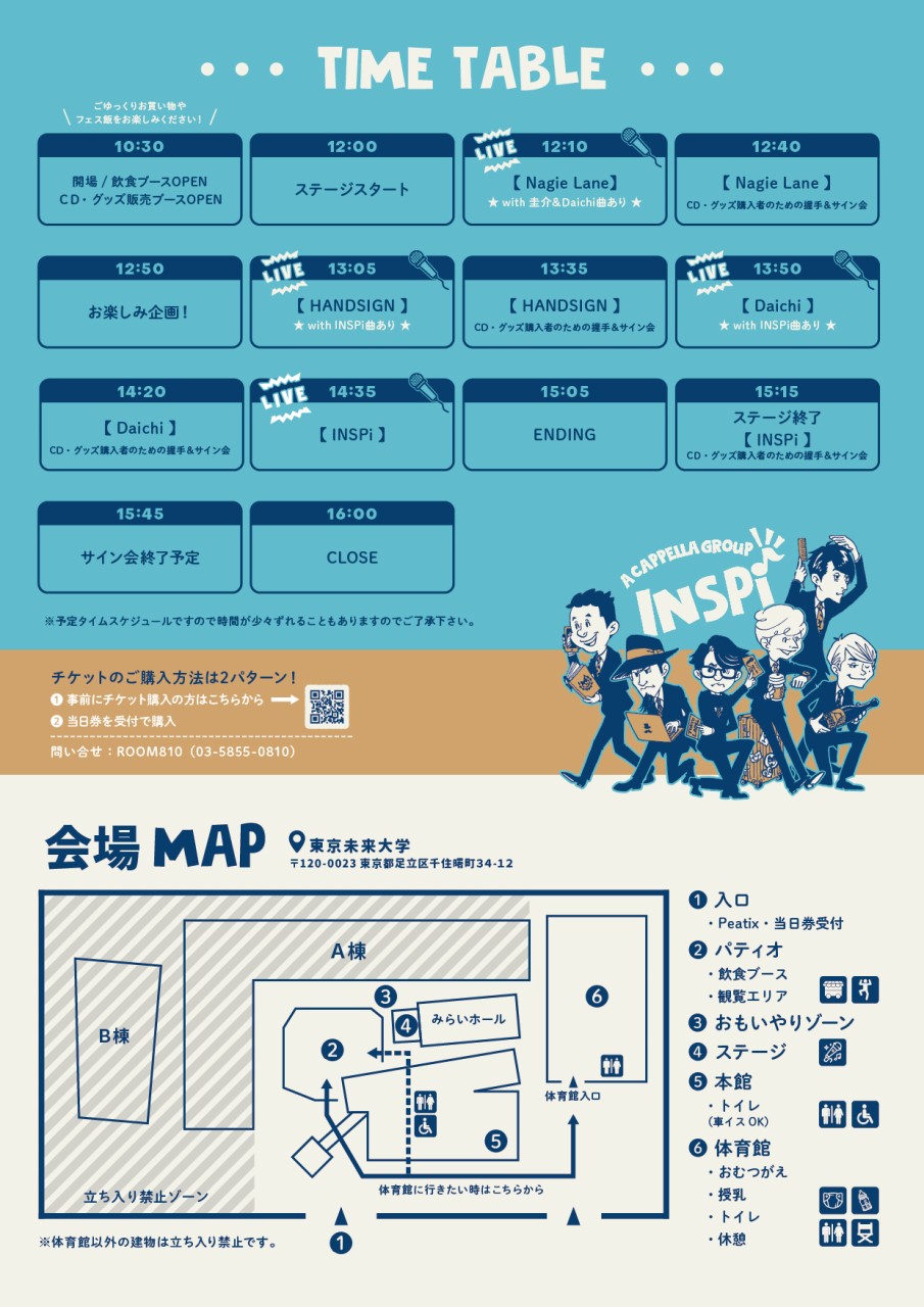 2019/10/13(日)生配信番組『INSPiのそれゆけペラリーマン』が開催する初のフェスイベント! 『ペラリーマンフェス2019〜ハモ&ピース〜』 2016年11月よりLINE Liveにて配信してきたアカペラグループINSPiの番組、「INSPiのそれゆけペラリーマン!」ペラリーマンフェス2019~ハモ&ピース~10/13(日)開催中止のお知らせ 10月13日に開催を予定しておりましたペラリーマンフェス2019は、台風19号の接近に伴い、皆様の安全を第一に考えた結果、お知らせ予定としていました日を早めて開催中止の判断をいたしました。 合わせて公演後に予定しておりました、ペラリーマンフェスアフターパーティも中止とさせて頂きます。 ペラリーマンフェス運営スタッフ、INSPiメンバーで台風情報や交通機関情報を収集し話合いましたが、残念ですが中止せざるを得ない状況であると判断致しました。 今後、振替公演の開催の可否についても慎重に検討していこうと思っております。 事前にチケットを購入くださった皆様には全額返金となります。 販売サイトの事情でレジャーシートも共にキャンセルとなり返金となってしまいますが、ご了承ください。レジャーシートにつきましては、せっかくご購入下さった皆様の為にも、なるべく早く販売を再開できればと思っております。 返金方法については、購入サイトのPEATIXからお知らせが届くようになっておりますので、そちらをお待ちください。 チケットを楽しみに購入して下さった皆様、当日券でご来場のご予定だった皆様、いつも番組を応援してくれている皆様、ゲストアーティストDaichiさん、HANDSIGNさん、Nagie Laneさんのパフォーマンスを楽しみにしてくださっていた皆さま、そして手作りガーランドをわざわざ送ってくださった皆様、この度は皆様のご期待に沿えずということになってしまいました。 送って頂きました、またこれから送って頂くガーランドは、番組など必ず活用の場を作り、皆様の目に届くようにしたいと思っております。 ペラリーマン運営チーム一同、INSPi一同 今回番組初となるフェスを開催!! ![]() 〈イベント詳細〉 【イベント名】 ペラリーマンフェス2019〜ハモ&ピース 【コンセプト】 『ハモ&ピース』 人と人、人と地域、地域と地域。 みんなが互いに持ち味を出し合いながら、フラットな関係で楽しくピースフルなハーモニーを奏でよう♪ 【日程】 2019年10月13日(日) 【開場 / 開演 / 閉園時間】 開場 10:30 (開場、飲食ブースもOPEN) 開演 12:00 終演 15:15 (予定終演時間) 退館 16:00 (16時までに完全に退館となります。) 【出演】 INSPi HANDSIGN / Daichi / Nagie Lane 【会場】 会場:東京未来大学 住所:〒120-0023 東京都足立区千住曙町34-12 ステージ:中庭外ステージ [立ち見](※雨天の場合、体育館ステージとなります。) 休憩スペース:体育館(※晴れの場合) ※東京未来大学への問い合わせ厳禁です。 お問い合わせはROOM810までお願い致します。 【チケット販売方法】 Peatixチケットアプリ(※販売は9/13(金)正午からとなります。) ※チケットのキャンセル・返金は出来ません。ご了承ください。 ※当日券の販売も予定しております。 Peatixイベントページ 【チケット詳細】 大人チケット:5500円(税込) 学生チケット:3300円(税込)※当日学生証をご提示頂きます。 オリジナルレジャーシート:1650円(税込)※限定130名の限定価格です。 乳幼児入場:無料 ※レジャーシートは、チケットと合わせてご購入ください。 入場チケット1枚につき、レジャーシート1枚ご購入いただけます。 レジャーシートのみのご購入、複数枚の購入はご遠慮ください。 レジャーシートのみ、またはチケット1枚につきレジャーシートを複数枚購入された場合はキャンセルとさせて頂きます。 その際に発生するキャンセル料などは自己負担となります。ご了承下さい。 ※オリジナルレジャーシートは、当日1980円(税込)で数量限定の物販も行う予定です。 ※尚、チケットの販売は9月13日正午からとなります。 【出展ブース】 後日公開! 【思いやりゾーン】 ステージ観覧には、ご年配、お体の不自由な方用に『思いやりゾーン』をご用意致します。 また、車椅子の場合、幅が90cm以内の車椅子であれば入場・移動が可能です。 皆さまが安心して楽しめるよう、スタッフが全力で補助させて頂きます。 【 for ベビーゾーン 】 簡易的ではありますが、授乳室・おむつ替えスペースを体育館内に設営致しますので 小さいお子様連れのご家族でもご安心してご来場いただけます。 【お問い合わせ先】 株式会社ROOM810 (それゆけペラリーマン企画制作) tel: 03-5855-0810 mail: info@room810.jp << 注意事項 >> •専用の駐車場はございませんので、公共交通機関をご利用いただくことをオススメ致します。ご了承下さい。 •入場チケットをお持ちの方は再入場可能です。 •飲食物(乳幼児の飲食は除く)の持ち込みはご遠慮頂いております。 •入場、イベント中はスタッフの指示に必ず従って下さい。 •お問い合わせはROOM810までお願い致します。 •原則、チケットのキャンセル・返